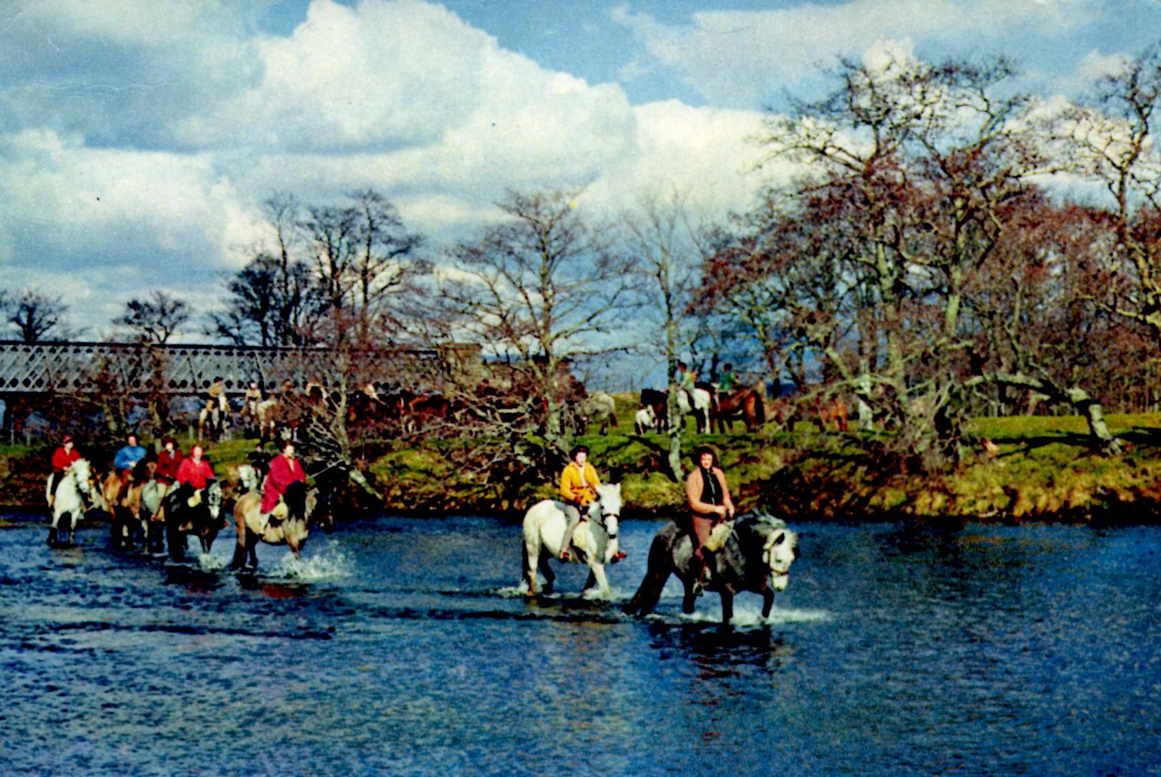 This postcard from my collection shows the manse, manse road itself runs at the bottom of the high ground. The hill ends in a bluff over the river which would have effectively limited the Northumbrian attack to the ford at its base. The manse in question now being the Columba House Hotel is on a small hill. The view from the south is now blocked by the new A9 which now crosses the Spey close to where the Wade road once forded the Spey. The position the Picts held does must have been a logical one to defend such as a river crossing because Ecfrith did not suspect a trap. One of the features of the Spey is that there are banks of shingle at many points, to earlier generations of Highlanders these would have been seen as ammunition dumps, full of “chuckies” to rain down on attackers as they waded across the shallows. Any of the Northumbrian elite wearing armour/chain mail would risk drowning if they stumbled at this point and fell. One might argue that there is no mention about fording of any river in the accounts of the battle, true, but many rivers would have to have been crossed and they are not mentioned either. If you look at later accounts of campaigning in the Highlands, such as General Mackay’s Memoirs, where we can trace the route taken the fording on most of the rivers is hardly mentioned if at all. Today because we normally cross rivers by means of bridges we would see the fording of a river as something memorable and unusual. The account states that the right flank of the Pictish army was observed to melt away after apparently being outflanked. There is another place where the Spey can be forded near Kingussie just upstream of the Ruthven bridge, in fact, there is a colour postcard of pony-trekkers fording the Spey.