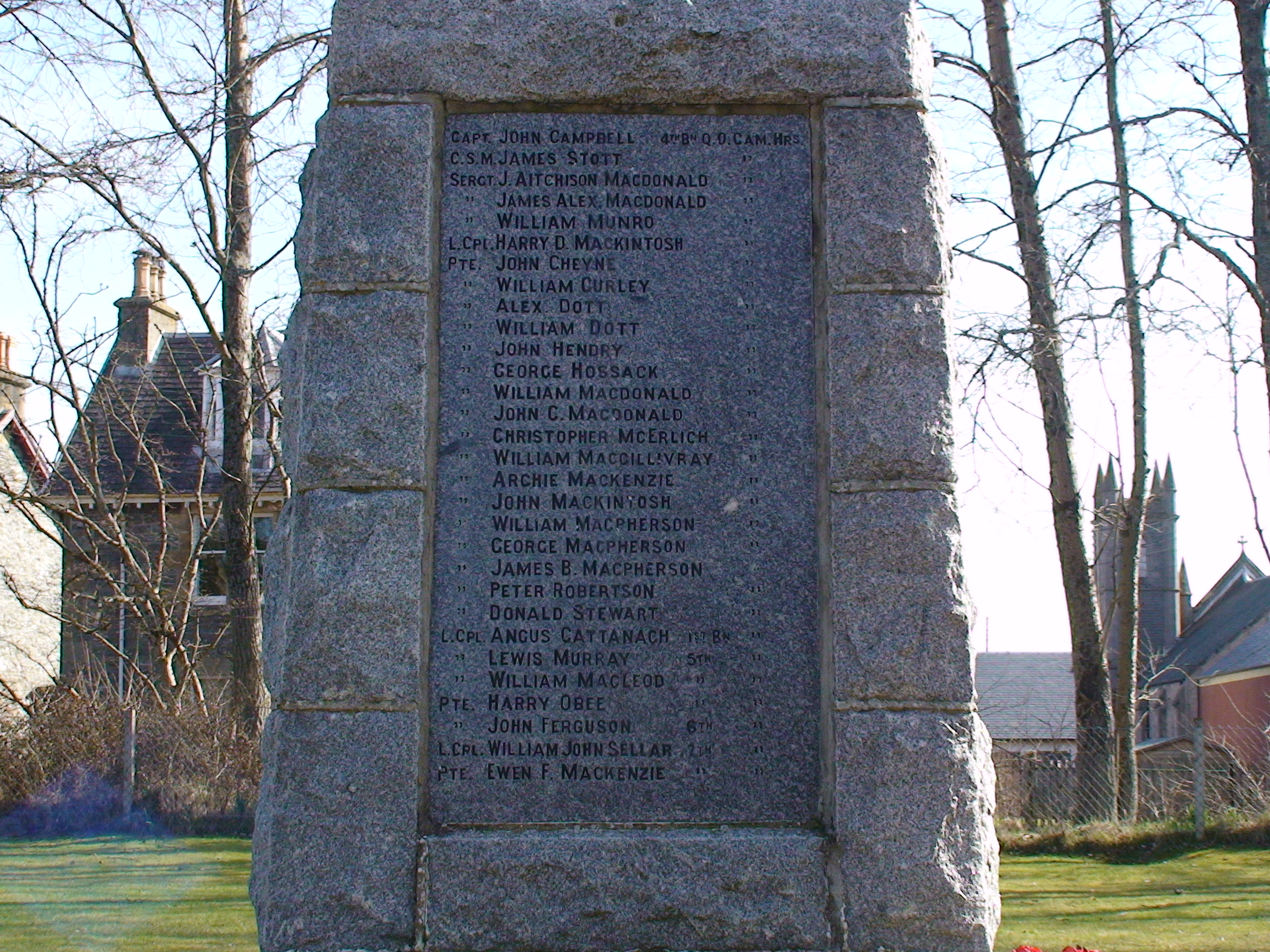 The photograph shows part of Kingussie’s War Memorial, one of two panels naming those who died during the First World War listing the names of those who served in the Cameron Highlanders. Most of them having served in the local Territorial Unit (F Company, 4th Camerons). How many people know anything of the individuals named there? Few and far between them. Rather ironic then that Remembrance services claim to remember them. The name on the top is that of Capt. John Campbell, he was killed on the morning of the 18th May 1915 during the battle of Festubert. The 4th Camerons had been ordered to capture a trench some 600-800 yards away, another battalion had been ordered to take positions on their right. They had attacked as it began to grow dark the previous evening. Not long after leaving their trenches they found that the ground they had to cross was intersected with ditches that were difficult to cross. Just before they reached the the German trench they found a deeper ditch that most had to swim across before reforming and storming the German trench. Having captured part of the trench they began to work along it aiming to locate the neighbouring unit unaware that their attack had failed. As dawn broke the men were isolated and the Germans began to counterattack. Soon it became inevitable that they had to retreat. As they began to evacuate the trench Captain Campbell who had already been wounded stayed behind firing his revolver. That was the last that was heard of him. A noble deed, a sacrifice of sorts undoubtedly, but as a sacrificial victim an already wounded man was hardly “without spot or blemish.”