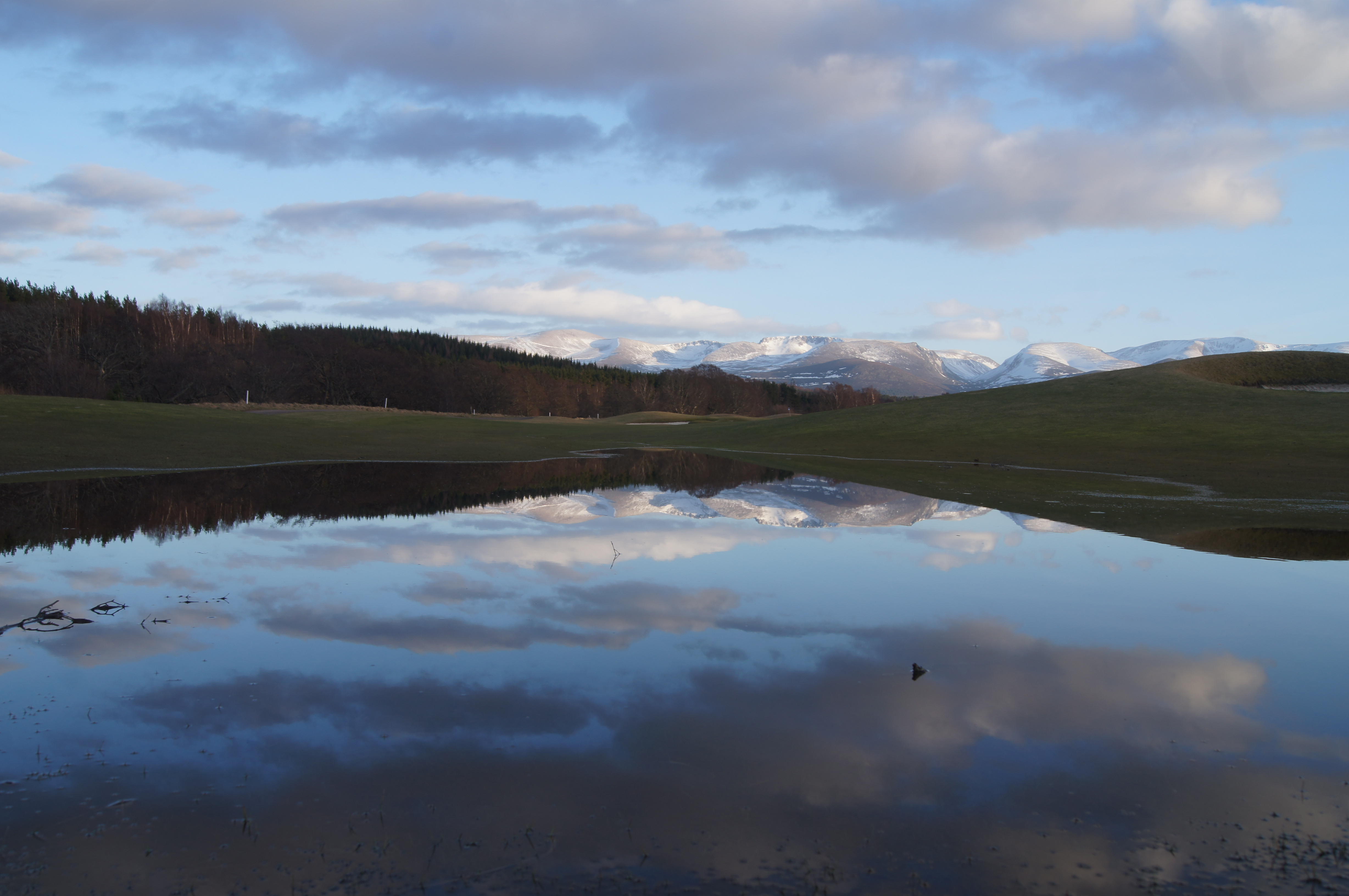 Last weekend there was a lot of heavy rainin the north of Scotland and the River Spey flooded its banks to a height not seen for many years. Some roads were inundated, as well as low lying fields. Amongst the areas underwater were large parts of the golf club. Creating several very large water hazards for any golfer foolhardy to play certain holes. But as the rain cleared away and the sun came out the river began to subside. As the river slowly returned towards more normal levels large bodies of water remained behind. As you can see from this photograph there are opportunities to take pictures that would, in normal conditions, be impossible. In this instance where there is water in the foreground is usually just the green grass of the fairway. That particular pond has dried up but there are other larger that remain though decreasing in size.